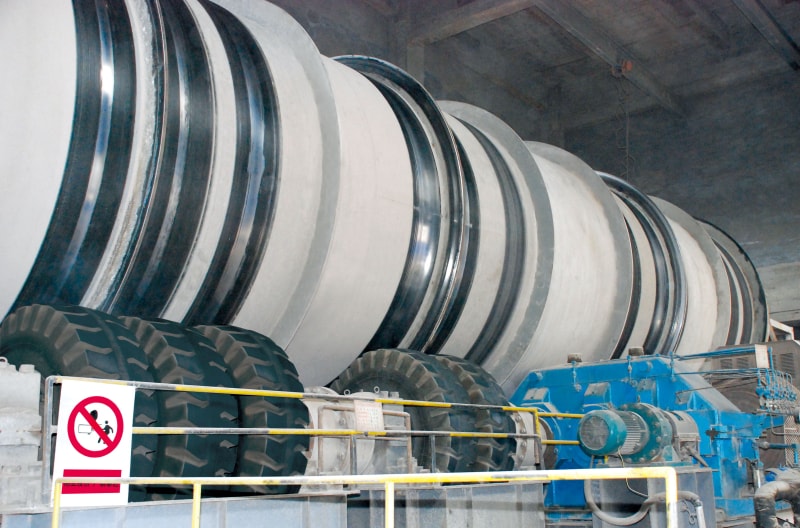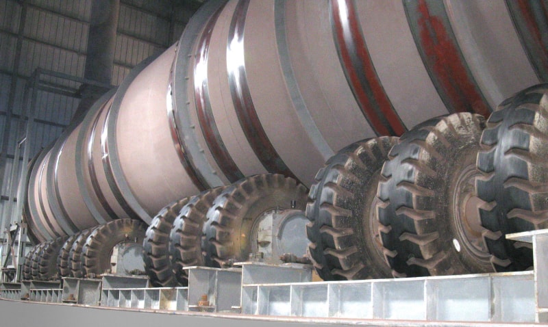 16.00-25規(guī)格海綿實芯輪胎配套在日照鋼鐵有限公司3.4米x14米混料機(jī)上